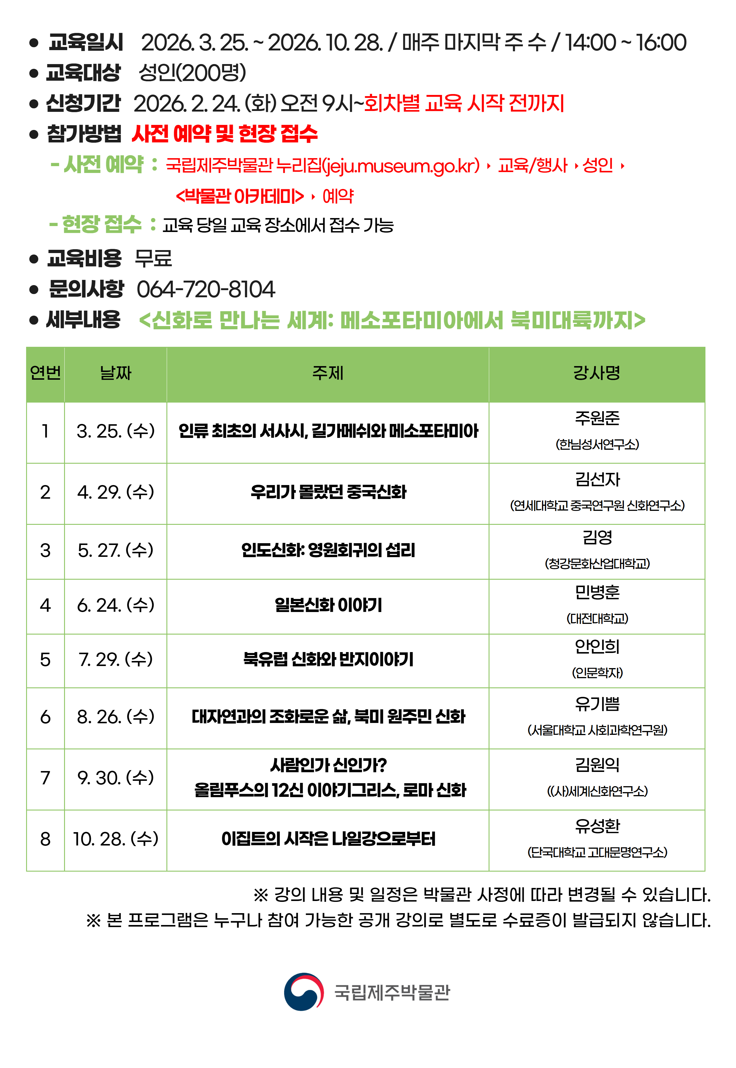 2026 국립제주박물관 아카데미 교육기간 2026-03-25 ~ 2026-10-28 교육장소국립제주박물관 강당 참가대상성인 누구나 첨부파일 ※ 교육프로그램 접수시간은 오전 09:00부터 시작됩니다.